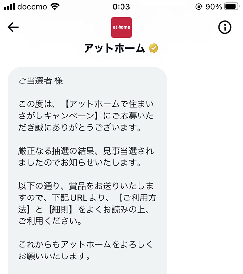 | アットホーム様より Amazonギフトが当選 | 500円相当 | X(旧Twitter)懸賞にて当選! |