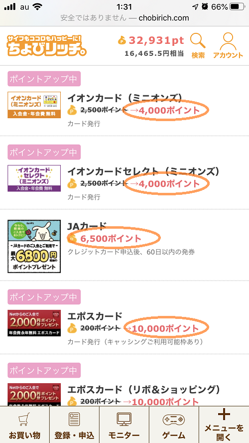 モッピーに次ぐ大手ポイントサイト。クレジットカード作成をはじめ様々な案件が掲載されています。 | |