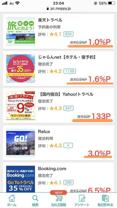 さらに、モッピーを経由して楽天トラベルなどで宿泊予約したり、食べログなどで飲食店の予約をすると、ポイントが貰えます。