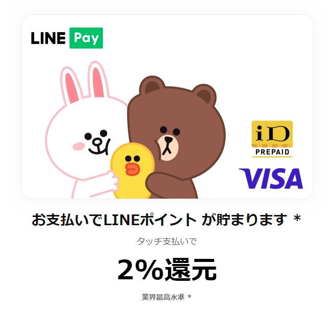 現在様々なキャッシュレス決済が利用できますが、タッチ払いするだけで常時購入金額の2%が還元されるVisa LINEPay プリペイドカード タッチ払いが最も最強です。毎月の利用金額に応じたポイント還元率など、ややこしい条件はありません。