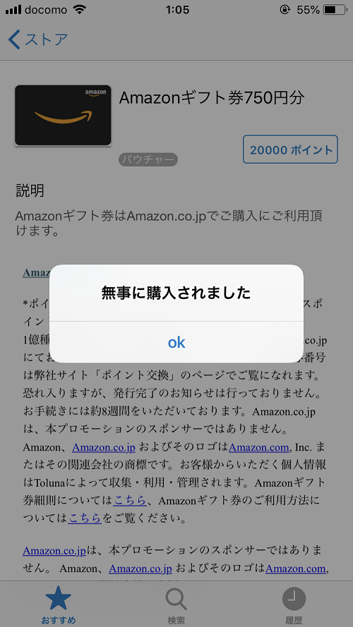なんと!手続きからたった1日でTolunaからAmazonギフト券750円分ギフトコードの発行処理が完了していました!