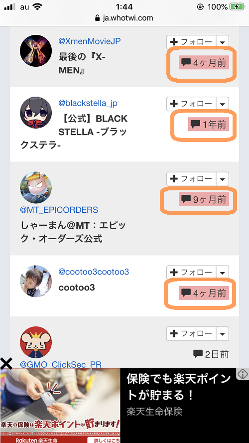 片思い(相互フォローでない)アカウントが一覧で表示されます。アカウントの横には、最後にツイートしてからの日数が表示されています。一覧を見ていくと画像のようにピンク色で〇ヵ月前、〇年前と表示されているアカウントが確認できます。